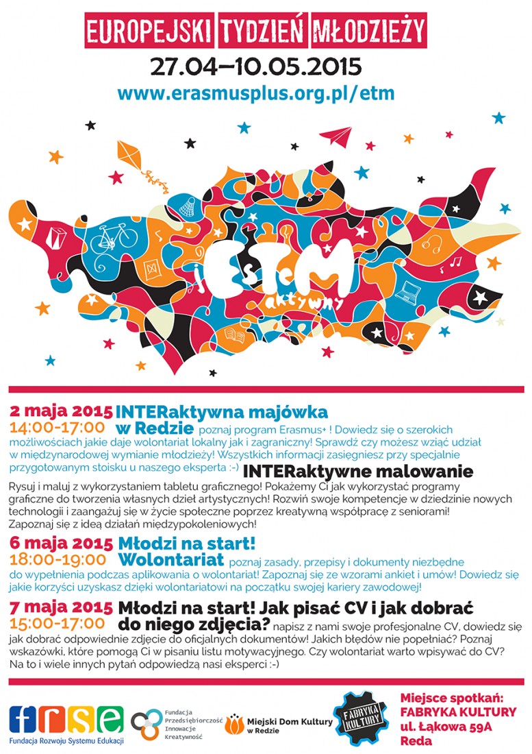 W sobotę (2 maja) rozpocznie się „INTERaktywna majówka w Redzie”. Od godziny 14:00 do 17:00 uczestnicy będą mogli zapoznać się z programem Erasmus+, a także dowiedzieć się jakie furtki otwiera lokalny i zagraniczny wolontariat. Eksperci doradzą uczestnikom, co należy zrobić, by wziąć udział w międzynarodowej wymianie młodzieży.