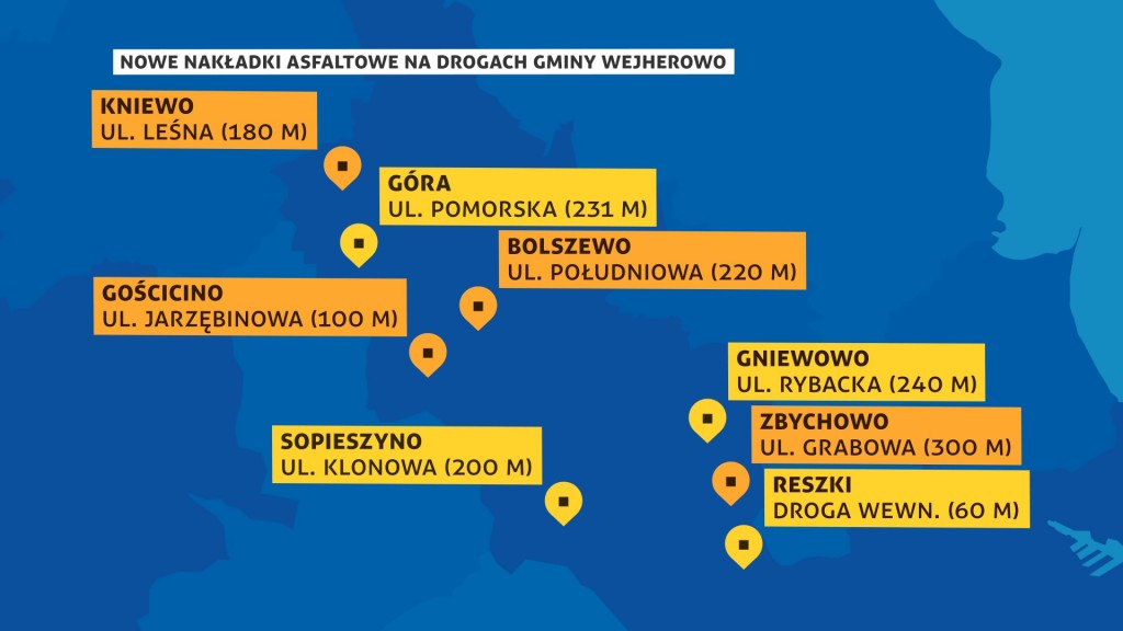 Nowe drogi oddano do użytku w ośmiu miejscowościach: w Gniewowie, Zbychowie, Reszkach, Bolszewie, Górze, Spieszynie, Gościcinie i Kniewie.