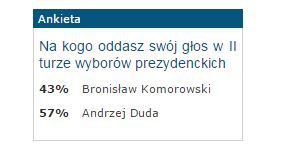 Gdyby o wyborze prezydenta w II turze mogli zadecydować wyłącznie czytelnicy naszego portalu, to stanowisko objąłby Andrzej Duda. Kandydat PiS wygrałby stosunkiem głosów 57 do 43 procent głosów.