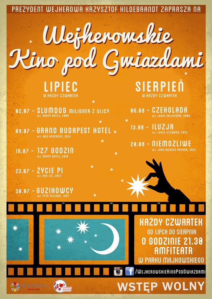 2 lipca w wejherowskim Amfiteatrze wyświetlony zostanie Slumdog. Milioner z ulicy, który zainauguruje cykl filmowych spotkań. Tydzień później mieszkańcy będą mieli możliwość obejrzenia Grand Budapest Hotel. Przez kilka kolejnych czwartków wyświetlone zostaną takie filmy jak 127 godzin, Życie PI, Guzikowcy, Czekolada, Iluzja i film Niemożliwe.