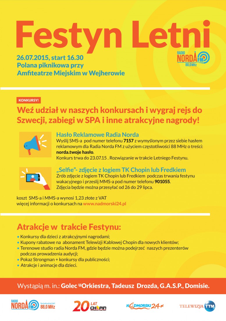 Jeden z konkursów będzie polegał na zrobieniu selfie z logiem Telewizji Kablowej Chopin bądź Fredkiem (maskotką firmy) podczas festynu. Wystarczy, że zrobisz sobie zdjęcie na tle loga i prześlesz je do nas MMS-em pod numer 901055. Zdjęcia można przesyłać od 26 do 29 lipca. Koszt wysłania MMS-a to 1,23 zł z VAT. Wyłonienie finalistów nastąpi do 31 lipca.