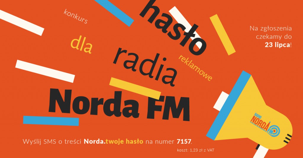 Aby wziąć udział w konkursie, wyślij SMS-a pod numer 7157 z wymyślonym przez siebie hasłem reklamowym dla Radia Norda FM, pamiętaj o wykorzystaniu w haśle częstotliwości radia, czyli 88,0 MHz. SMS powinien wyglądać następująco – NORDA.TWOJE HASŁO. Koszt wysłania SMS-a to 1,23 zł z VAT.