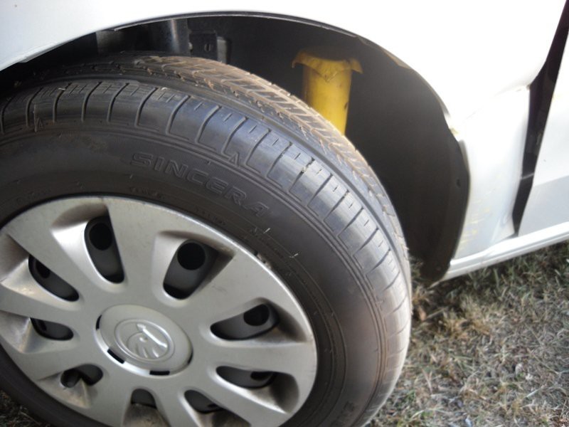 Słupek zaklinował się pomiędzy kołem, karoserią i przednim zawieszeniem. Na miejsce wezwano więc straż pożarną.