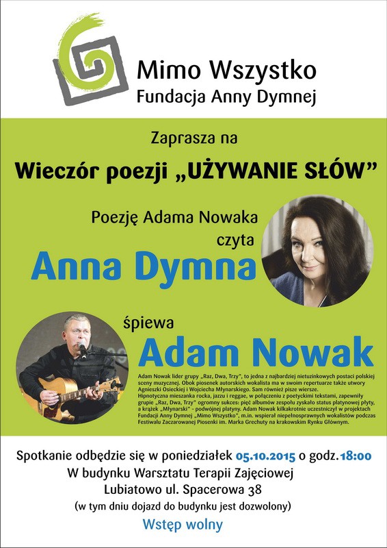 Na spotkaniu, zatytułowanym „Używanie słów”, wspólnie wystąpią Anna Dymna oraz Adam Nowak - jeden z najbardziej nietuzinkowych artystów polskiej sceny muzycznej. Lider zespołu „Raz, Dwa, Trzy” jest przyjacielem Fundacji Anny Dymnej „Mimo Wszystko”, a w Lubiatowie zaśpiewa kilka swoich piosenek.