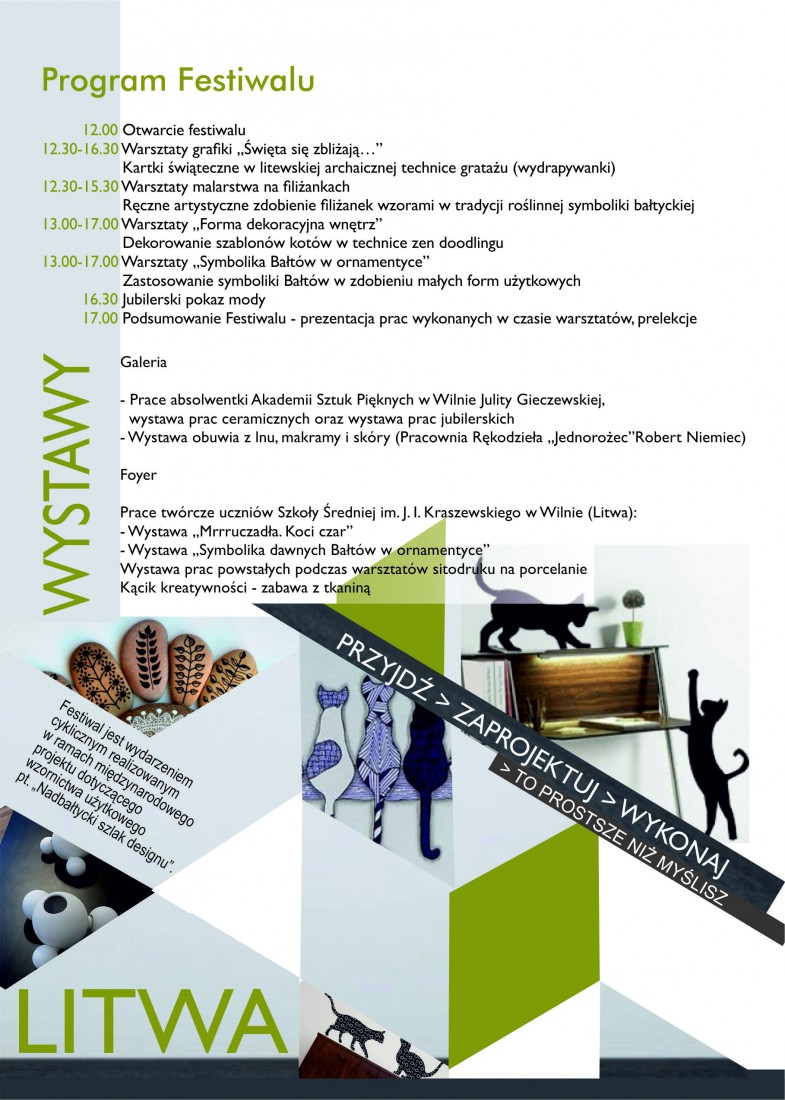 Niezwykłe wydarzenie, jakim jest festiwal, to wstęp do samodzielnego projektowania i wykonawstwa przedmiotów użytkowych. Cykliczne przedsięwzięcie realizowane w ramach międzynarodowego projektu dotyczącego wzornictwa użytkowego pt. „Nadbałtycki szlak designu" ma swój motyw przewodni w postaci jednego z państw regionu. Tematem październikowego spotkania jest Litwa.