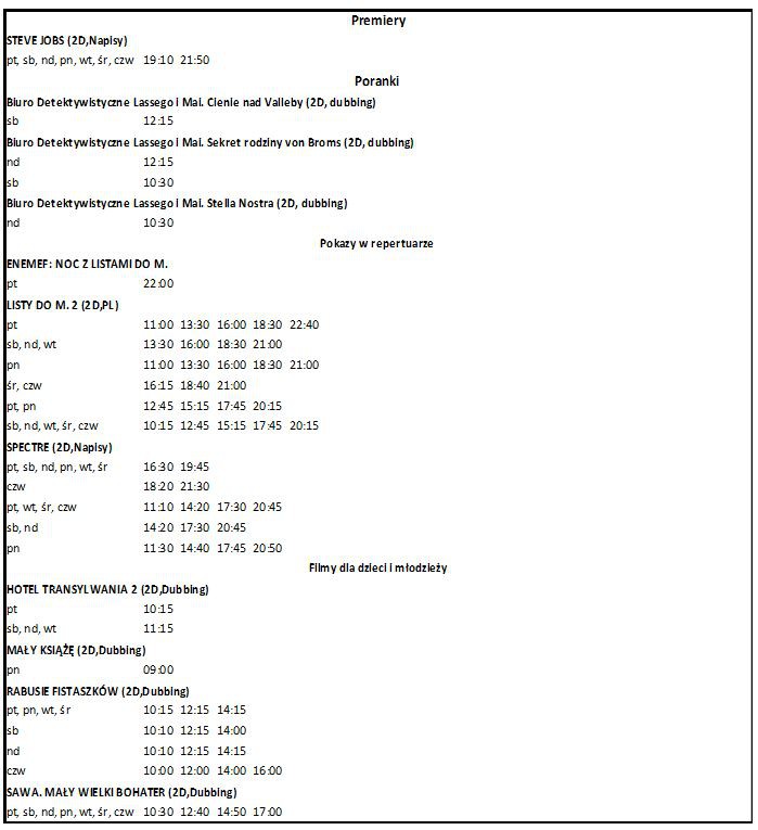Harmonogram projekcji – pokazy weekendowe dla widzów indywidualnych: