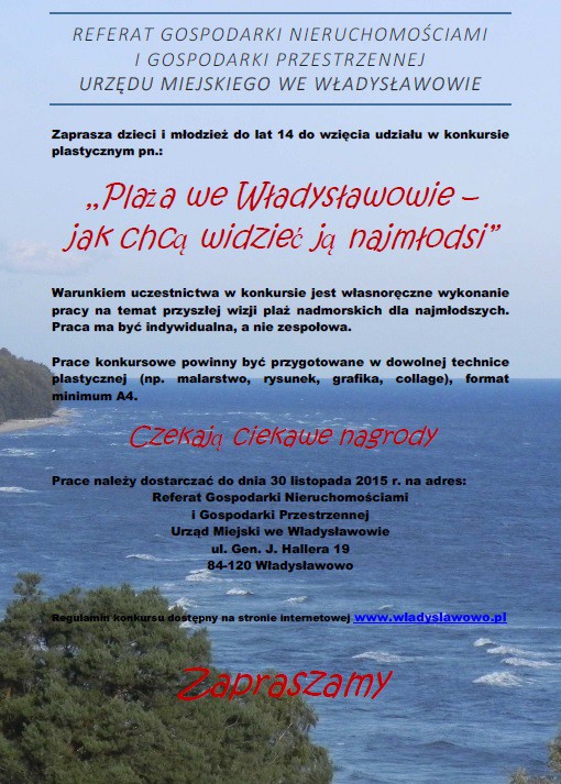 Prace konkursowe należy dostarczyć do 30 listopada 2015 roku na adres: Referat Gospodarki Nieruchomościami i Gospodarki Przestrzennej, Urząd Miejski we Władysławowie, ul. Gen. J. Hallera 19, 84-120 Władysławowo.