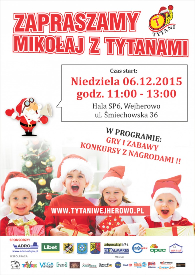 Mikołaj z Tytanami - W najbliższą niedzielę (6 grudnia) w godzinach od 11:00 do 13:00 odbędzie się Mikołaj z Tytanami. Spotkanie odbędzie się na hali w Zespole Szkół nr 1 w Wejherowie. Sportowcy zapraszają całe rodziny. Wśród atrakcji gry, zabawy i konkursy z nagrodami. Więcej informacji TUTAJ.