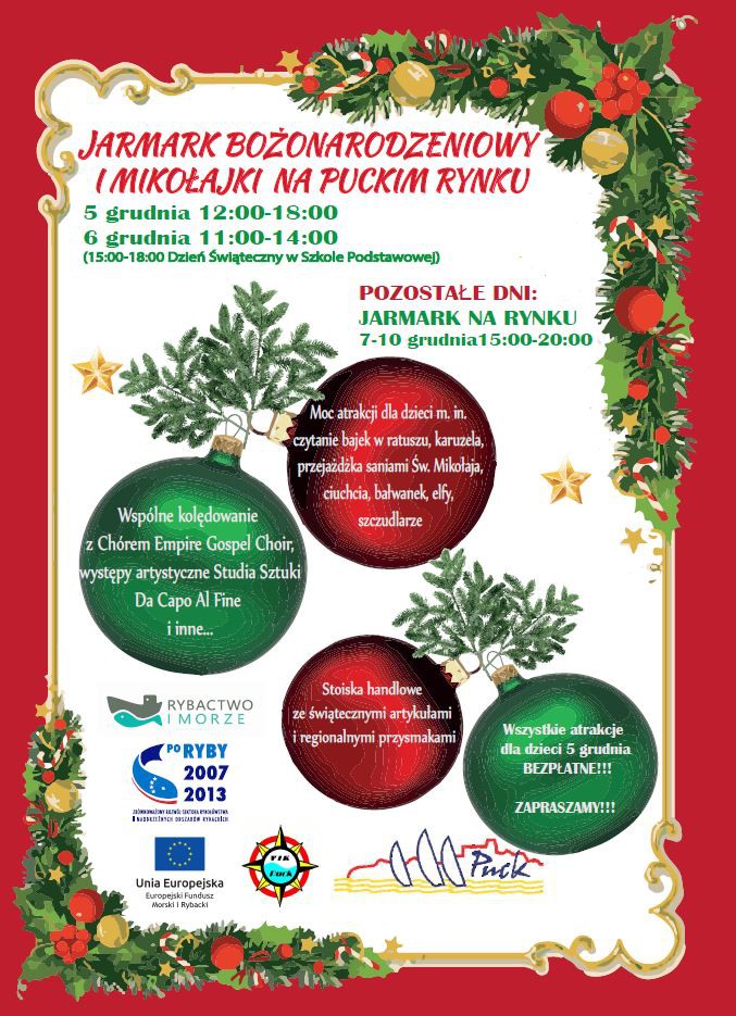 Jarmark Bożonarodzeniowy i Mikołajki w Pucku - Włodarze Pucka zapraszają Jarmark Bożonarodzeniowy i Mikołajki, które odbędą się na miejskim rynku. Wydarzenia odbędą się w dniach: 5 i 6 grudnia. Na mieszkańców czeka moc atrakcji dla dzieci: między innymi czytanie bajek w ratuszu, karuzela, przejażdżka saniami Św. Mikołaja, ciuchcia, bałwanek, elfy i szczudlarze, a także wiele innych. Więcej informacji znajduje się TUTAJ.