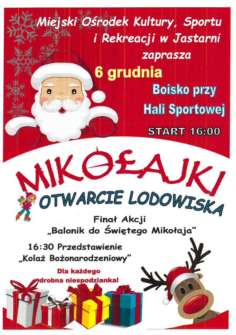 Akcja Balonik do Świętego Mikołaja - Miejski Ośrodek Kultury, Sportu i Rekreacji w Jastarni zaprasza wszystkie dzieci do udziału w akcji "Balonik do Świętego Mikołaja". W niedzielę, 6 grudnia, o godzinie 16:00 na boisku przy Hali Sportowej, dzieci będą wysyłać listy do Świętego Mikołaja za pomocą balonów. Każdy otrzyma także drobny upominek. Więcej informacji TUTAJ.