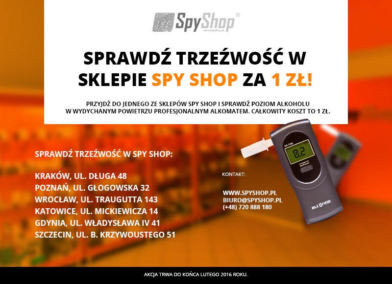 Sieć sklepów detektywistycznych Spy Shop organizuje akcję „Badanie alkomatem za 1 zł”. Każdy kierowca może przyjść i niemal za darmo zbadać swoją trzeźwość w sklepach stacjonarnych tej sieci.