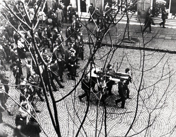 Ciało jednego z zabitych – Zbigniewa Godlewskiego – demonstranci ułożyli na drzwiach i pod ostrzałem petard i gazów łzawiących nieśli przez miasto. Ta fotografia stała się symbolem masakry grudniowej w Gdyni. Fot. Edmund Pepliński / zbiory ECS / tekapomorska.pl