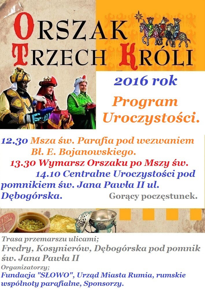 Uroczystości Orszaku Trzech Króli rozpoczną się mszą świętą o godzinie 12:30 w Parafii Błogosławionego Edmunda Bojanowskiego w Rumi. Główne uroczystości odbędą się pod pomnikiem św. Jana Pawła II (ul. Dębogórska). Marszałkiem Orszaku został Mirosław Słowikowski.
