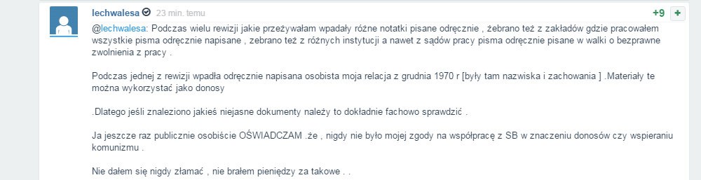- Popełniłem błąd ale nie taki, dałem słowo że go nie ujawnię na pewno nie teraz jeszcze nie teraz. Chyba że ujawnią go inni. Jeszcze żyje człowiek sprawca, który powinien ujawnić prawdę i na to liczę. Miałem miękkie serce. W internowaniu napisano że wypiłem dużo alkoholu. Prawda jest że ani jednej butelki wódki ani białej ani kolorowej, ani jednego piwa, parę szampanów i kilka win. Pozwoliłem natomiast brać na moje konto, kiedy mnie proszono. Z tego widać że było pobrane trochę tego za moją wiedzą, ale nie dla mnie. Podobnie jest i w tej sprawie, współpracy, pieniędzy i donosów. Ja nie mam nic z tym wspólnego. Ja dotrzymuje danego słowa przyrzeczenia nawet przeciwnikom Jeśli ten sprawca nie ujawni prawdy będzie kłopot, ale ja wierzę że to zrobi. Wierzę że prawda się obroni – czytamy na mikroblogu Lecha Wałęsy na stronie wykop.pl.
