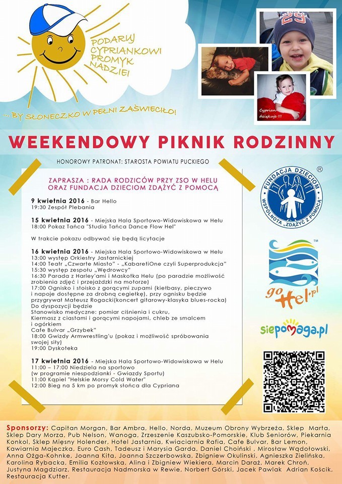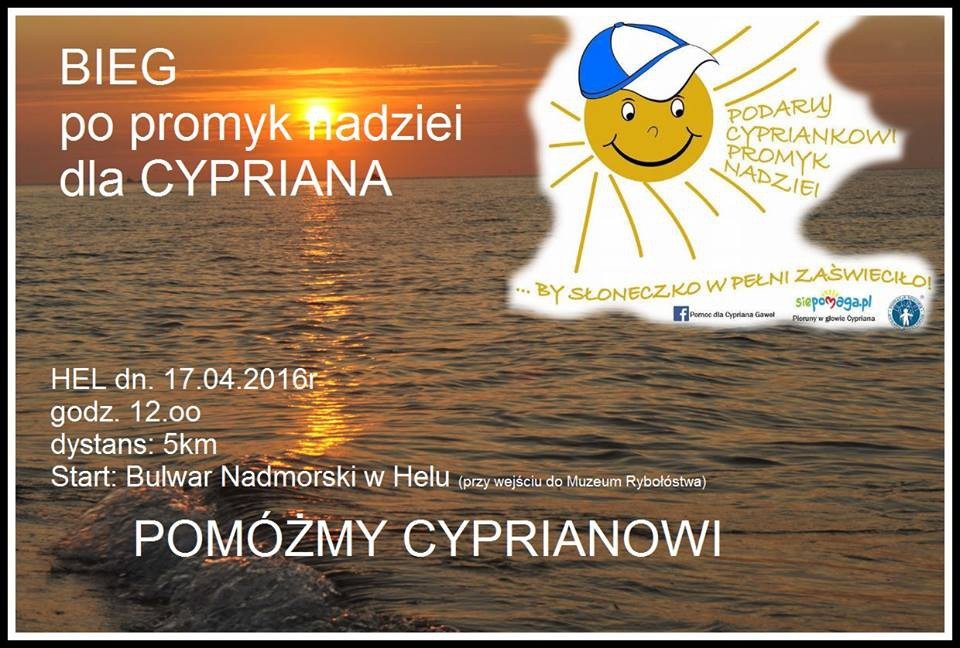 Przed nami szereg wydarzeń, podczas których zbierane będą fundusze na leczenie i rehabilitację niespełna 3-letniego Cypriana z Helu, cierpiącego na lekooporną padaczkę. Choroba powoduje, że chłopiec ma problemy ze spaniem i chodzeniem, a także niewiele mówi. Rodzice i przyjaciele zbierają środki na kosztowaną operację, która pomoże Cyprianowi wyzdrowieć.