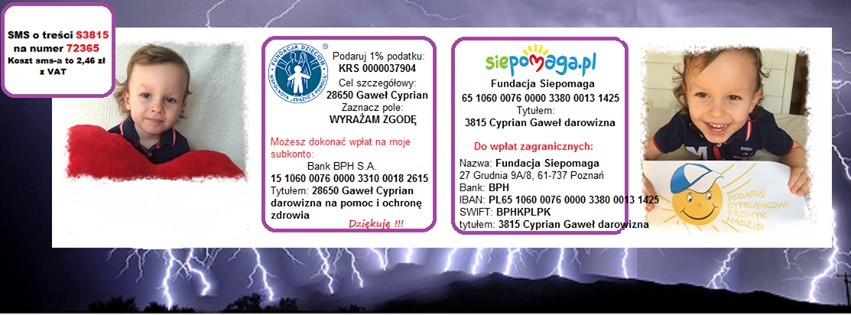 Osoby chcące przekazać darowiznę pieniężną, mogą dokonać przelewu: Fundacja Dzieciom "Zdążyć z Pomocą", Bank BPH S.A. 15 1060 0076 0000 3310 0018 2615, Tytułem: 28650 Gaweł Cyprian i Nicolas darowizna na pomoc i ochronę zdrowia.
