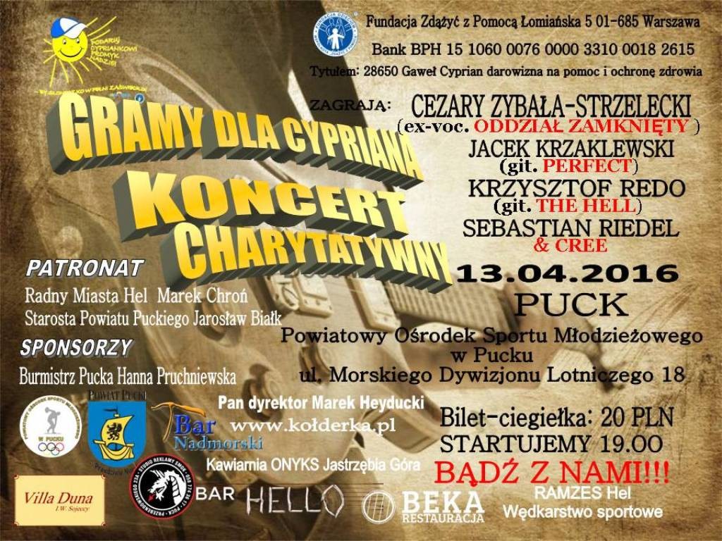 Pierwsze z nich zaplanowano na dzisiejszy wieczór (13 kwietnia) w Powiatowym Ośrodku Sportu Młodzieżowego w Pucku. O godzinie 19:00 odbędzie się tam koncert, podczas którego usłyszymy m.in. byłego wokalistę Oddziału Zamkniętego, czyli Cezarego Zybałę-Strzeleckiego. Koszt biletu-cegiełki to 20 złotych.