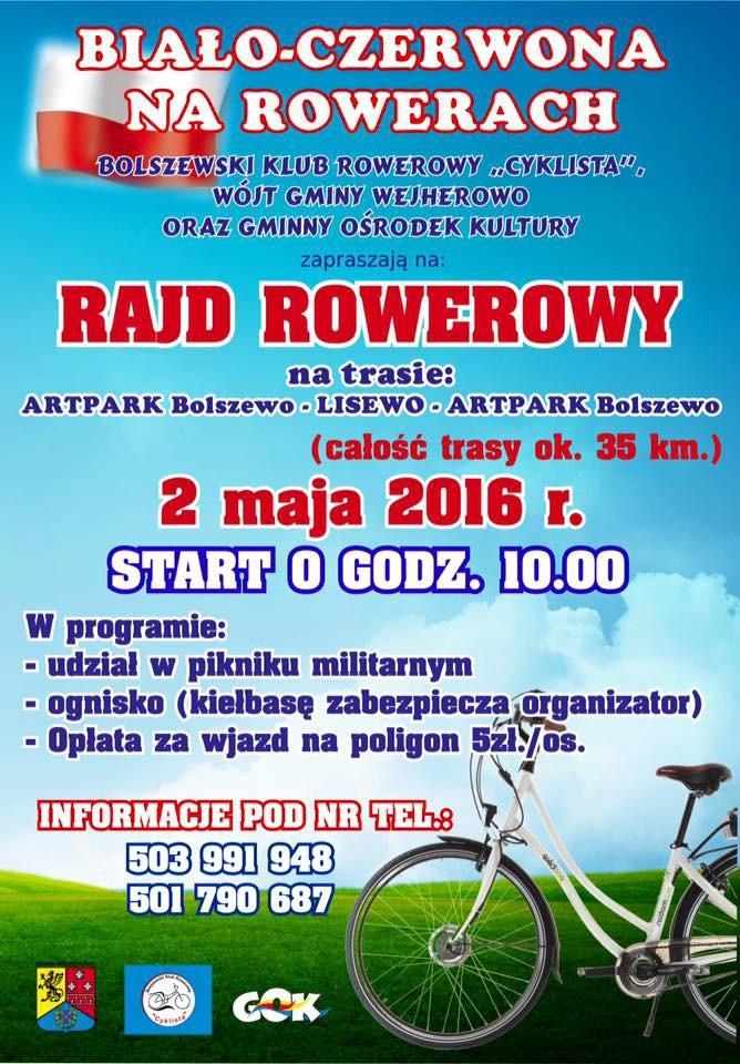 Od Artparku w Bolszewie, przez Orle i Kniewo, aż do Lisewa, gdzie czekał na uczestników piknik i ognisko. Tak wyglądała 35-kilometrowa trasa rajdu rowerowego, zorganizowanego przez Bolszewski Klub Rowerowy "Cyklista". W związku z Dniem Flagi Rzeczpospolitej Polskiej (2 maja) wydarzenie miało również wymiar patriotyczny.