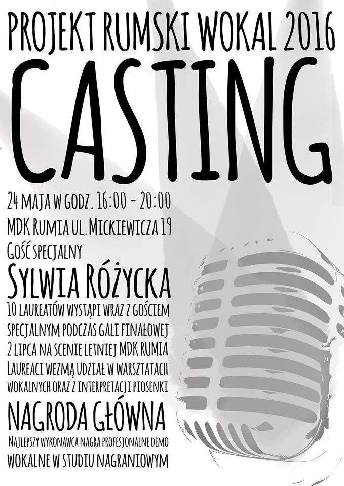 Casting rozpocznie się 24 maja (wtorek) o godzinie 16:00 w Miejskim Domu Kultury w Rumi – ul. Mickiewicza 19. Więcej informacji o wydarzeniu znaleźć można na Facebooku.