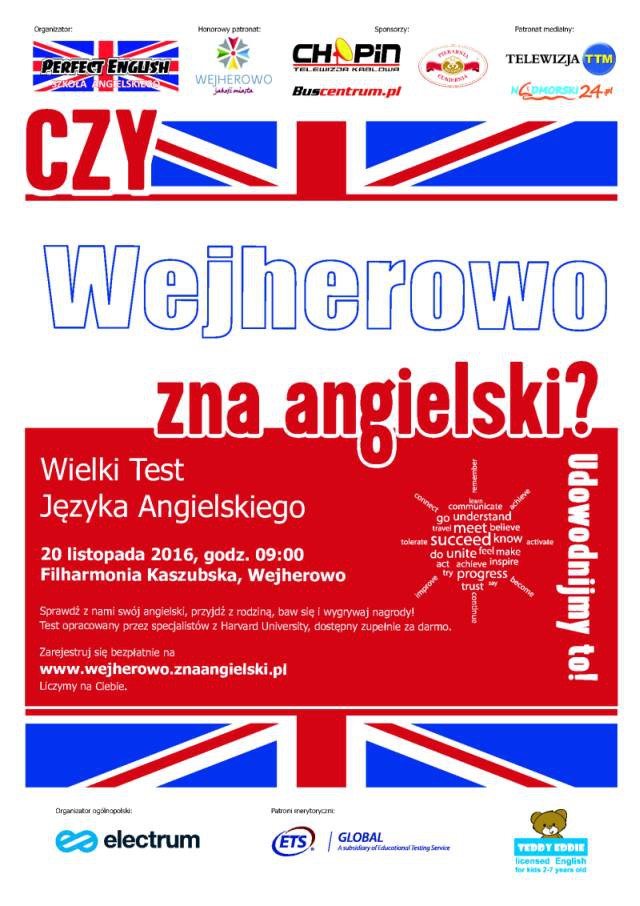 Mieszkańcy Wejherowa i okolic napiszą 20 listopada w Filharmonii Kaszubskiej „Wielki test języka angielskiego”. Jest to ogólnopolskie wydarzenie edukacyjne, które po raz czwarty odbędzie się w kilkudziesięciu miastach Polski.