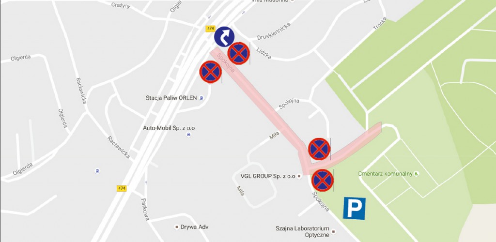 Obie strony ul. Spokojnej od skrzyżowania z ul. Wielkopolską aż do drogi dojazdowej jak również sama droga na cmentarz objęte zostaną w dniach: 28.10-1.11 zakazem zatrzymywania się. Kierowcy będą mogli zaparkować pojazdy na parkingu zlokalizowanym przy ulicy Spokojnej - za drogą dojazdową do cmentarza.