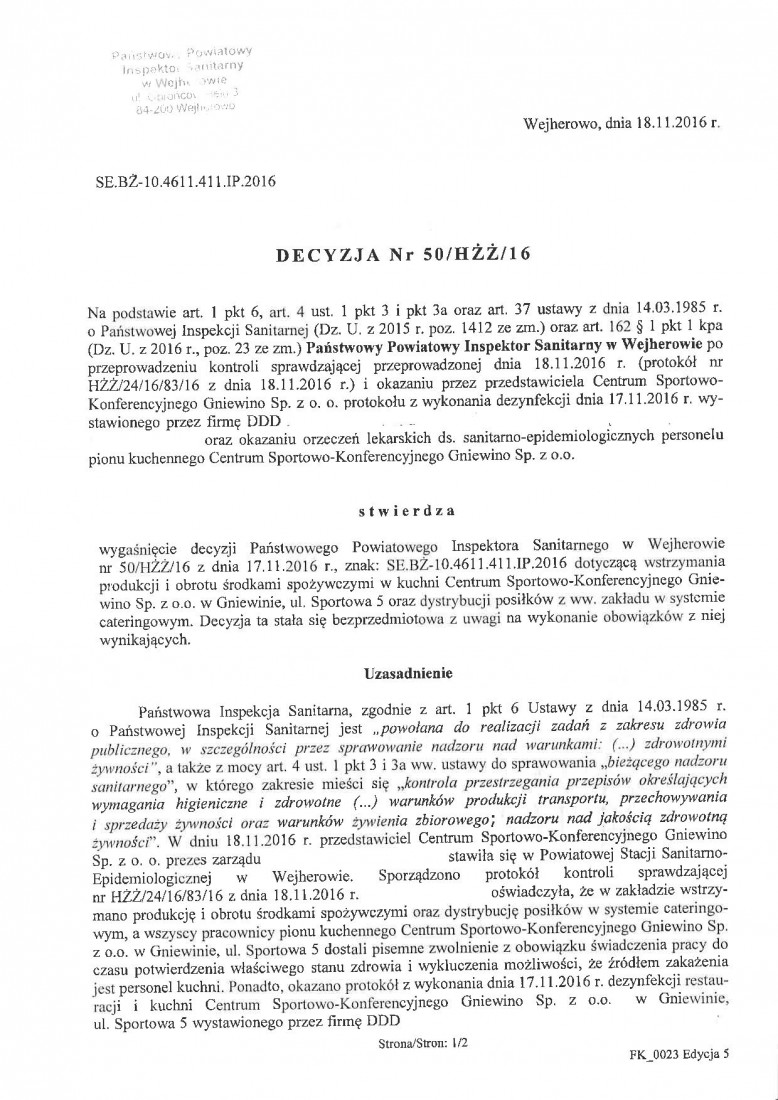 Decyzja Państwowego Powiatowego Inspektora Sanitarnego - dokumenty przesłane przez Centrum Sportowo-Konferencyjne w Gniewinie
