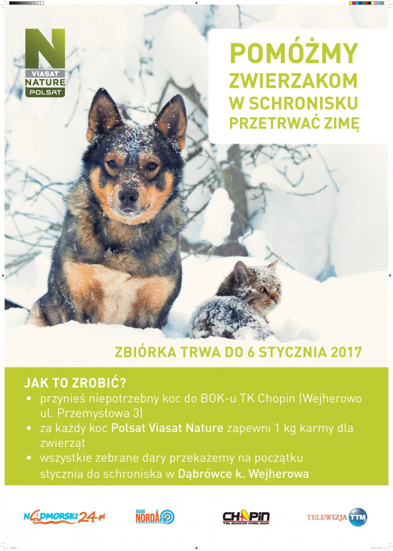 Telewizja Kablowa Chopin wspólnie z Polsat Viasat Nature organizuje akcję pomocy zwierzętom przebywającym w schronisku w Dąbrówce. Wystarczy przynieść niepotrzebny koc do Biura Obsługi Klienta przy ulicy Przemysłowej 3 w Wejherowie. Za każdy koc Polsat Viasat Nature zapewni kilogram karmy dla zwierząt. Zbiórka trwa do 6 stycznia, a wszystkie zebrane dary zostaną przekazane 9 stycznia do schroniska.