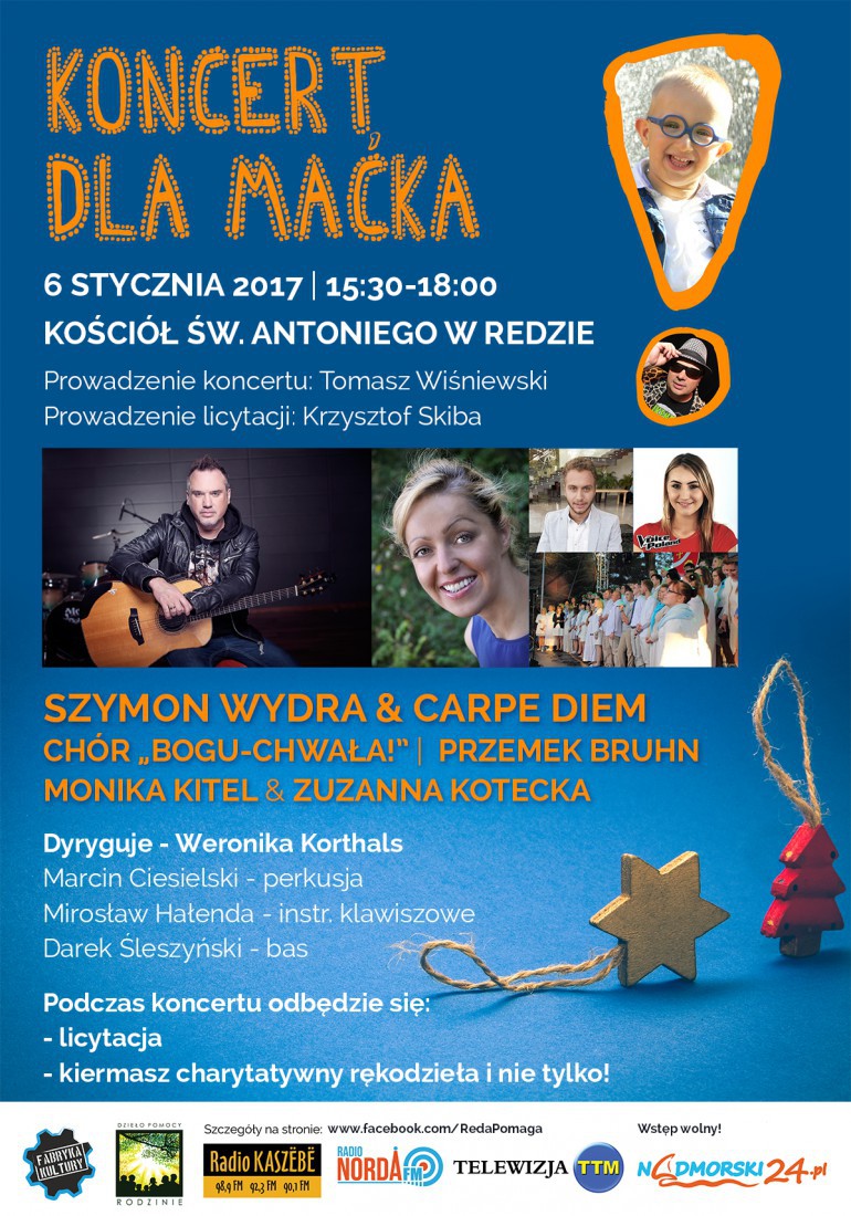 W ramach uroczystości Trzech Króli odbędzie się charytatywny koncert w godzinach 15:30-18:00 w kościele św. Antoniego w Redzie. Muzycznym gościem specjalnym koncertu będzie Szymon Wydra z zespołem Carpe Diem. Na scenie wystąpi również Chór "Bogu - Chwała!, uczestniczki programu Voice of Poland - Monika Kitel i Zuzanna Kotecka oraz zwycięzca konkursu Kaszubski Idol - Przemek Bruhn. Dyrygować będzie Weronika Korthals. Odbędzie się także licytacja, którą tradycyjnie poprowadzi Krzysztof Skiba oraz kiermasz charytatywny oferujący m.in. rękodzieła. Całość wydarzenia poprowadzi Tomasz Wiśniewski, dyrektor Miejskiego Domu Kultury. Dochód zostanie przeznaczony na pomoc dla 8-letniego Maćka. Więcej informacji TUTAJ.