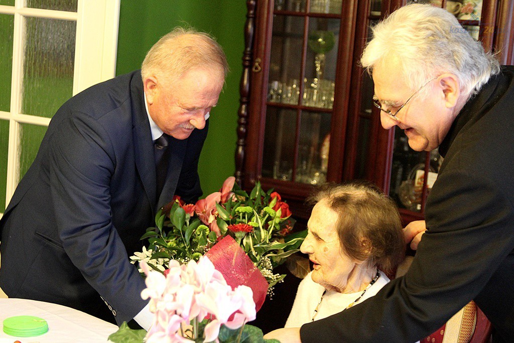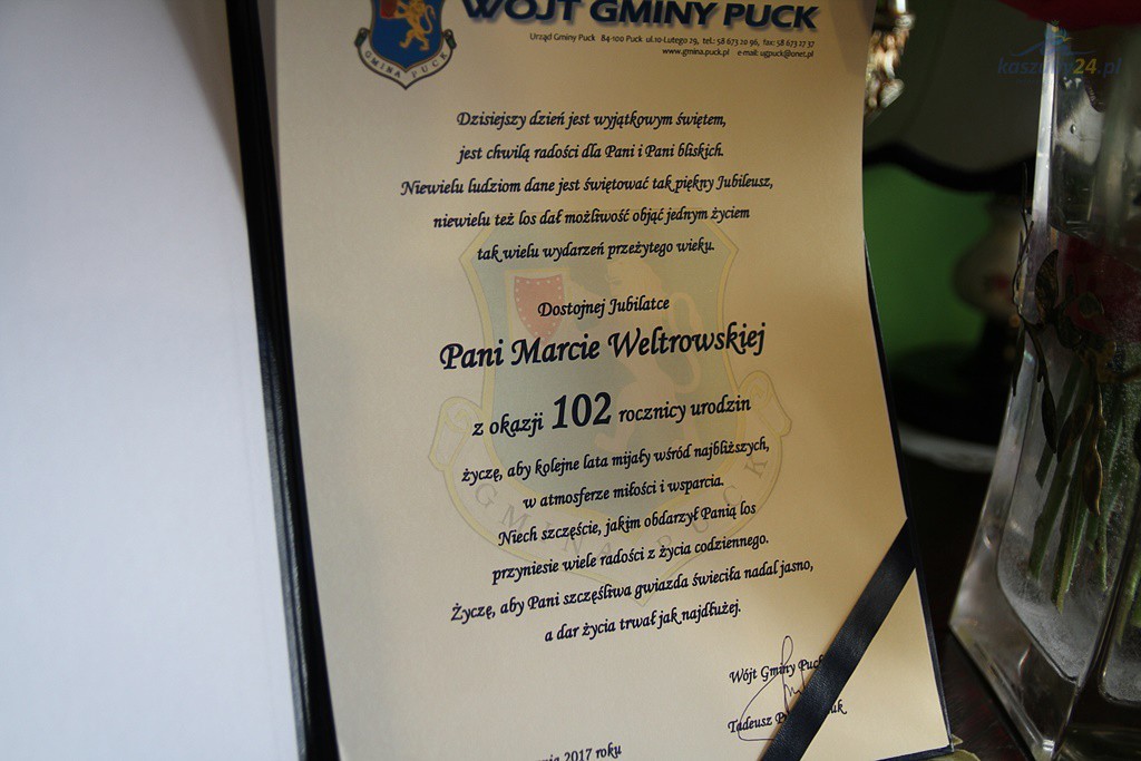Pani Marta jest najstarszą mieszkanką gminy Puck, dlatego urodzinową wizytę złożyli jej między innymi lokalni włodarze. Samorządowcy wręczyli jubilatce pisemne życzenia, bukiety kwiatów oraz upominki.