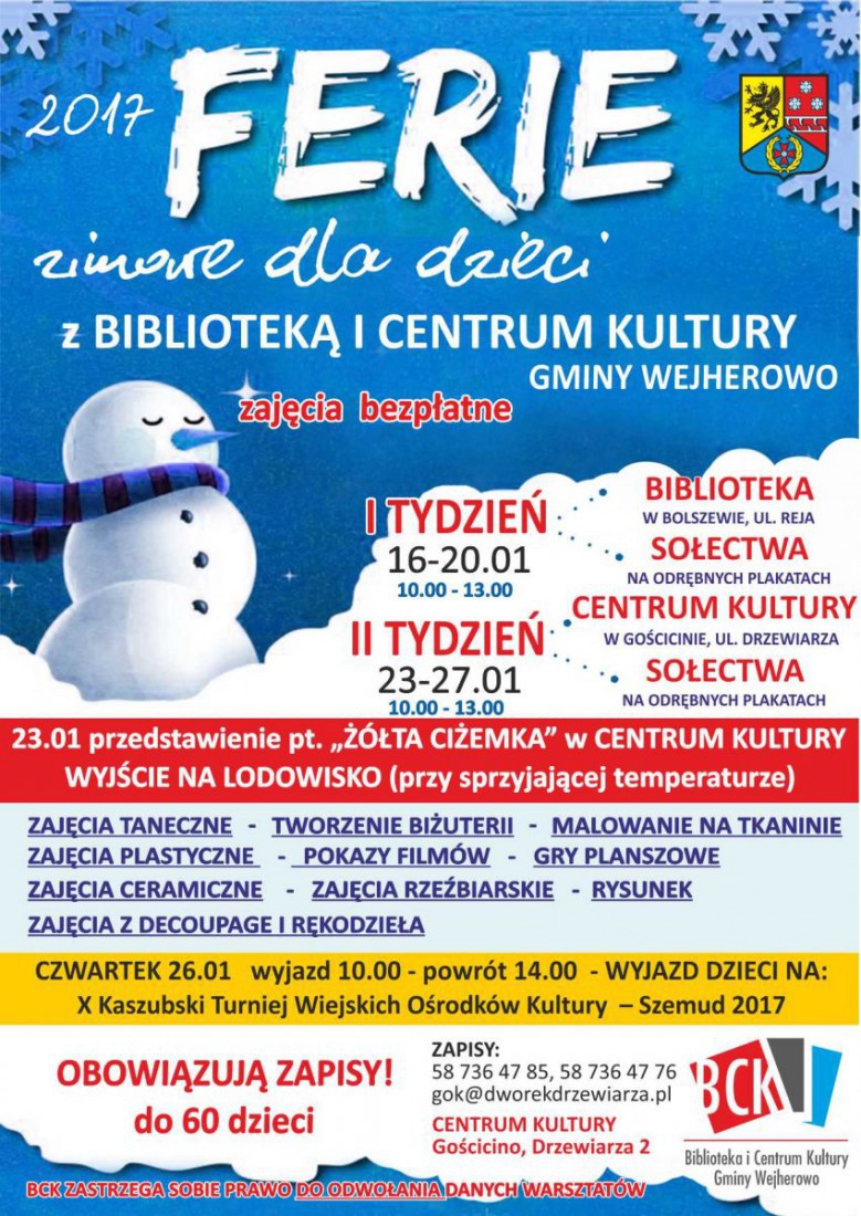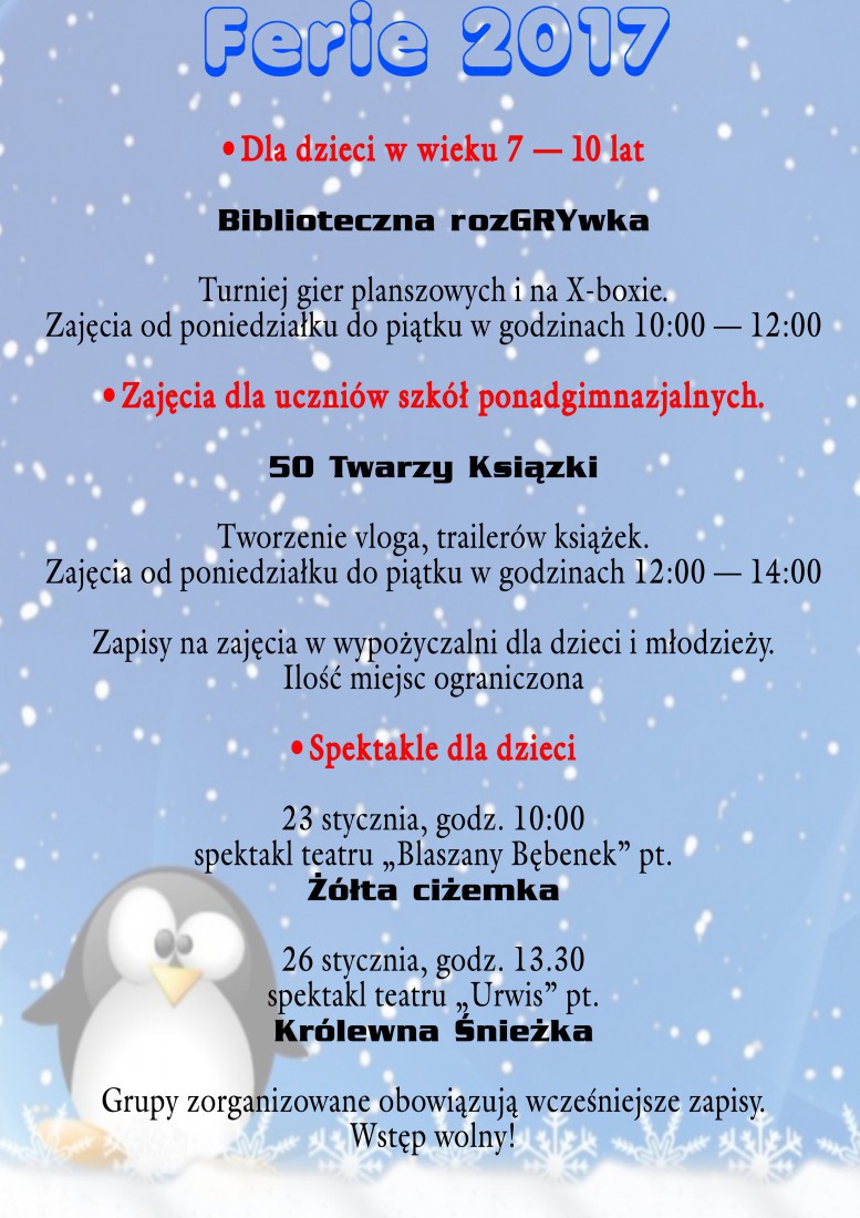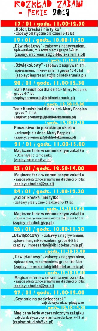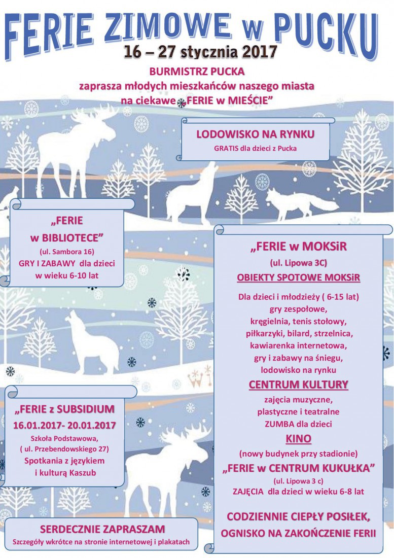 W okresie zimowych ferii szkolnych od 16 stycznia do 27 stycznia 2017 roku: