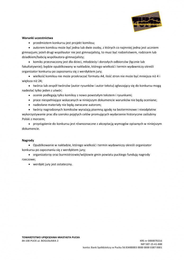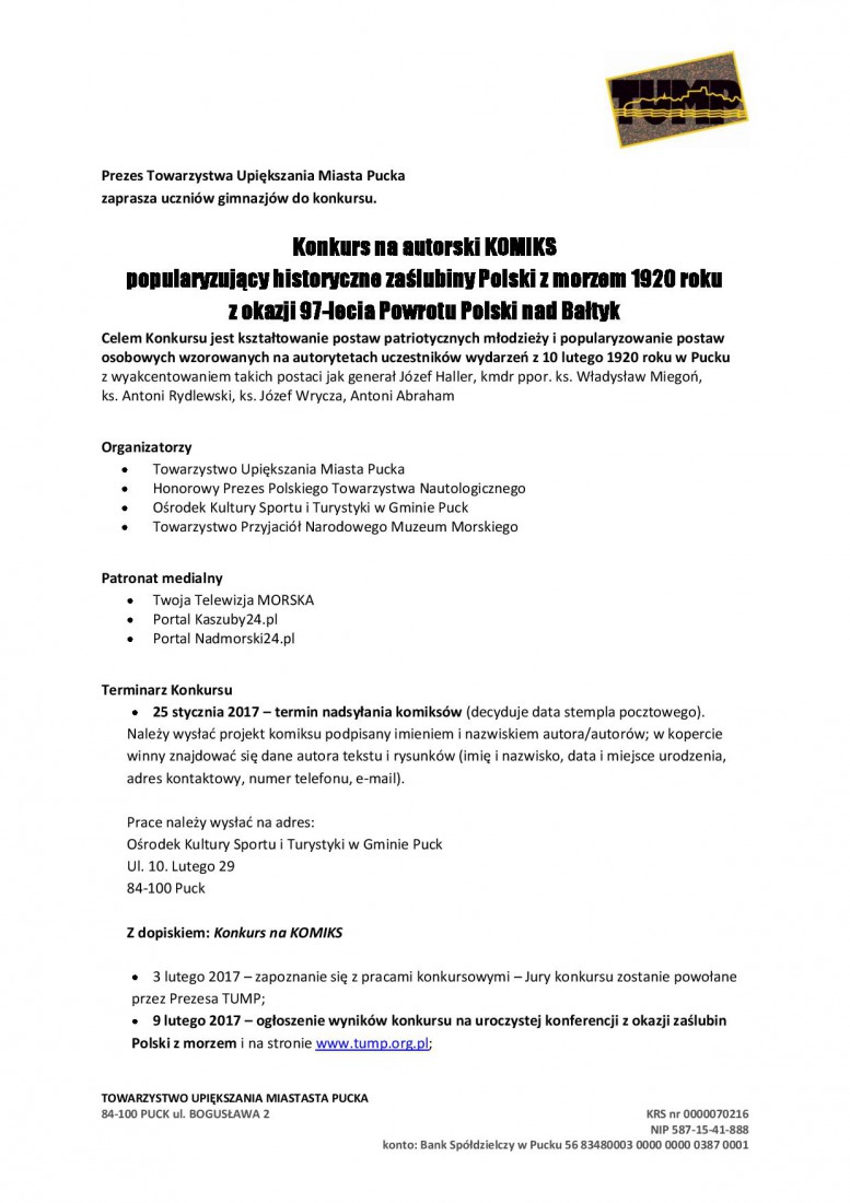 Projekt komiksu, wraz z danymi autora tekstu i rysunków (imię i nazwisko, data i miejsce urodzenia, adres kontaktowy, numer telefonu, e–mail) oraz dopiskiem: Konkurs na KOMIKS należy przesłać do 25 stycznia na adres Ośrodka Kultury Sportu i Turystyki w Gminie Puck. Wyniki konkursu zostaną ogłoszone 9 lutego, podczas uroczystej konferencji z okazji zaślubin Polski z morzem. Więcej informacji można znaleźć na tej stronie.