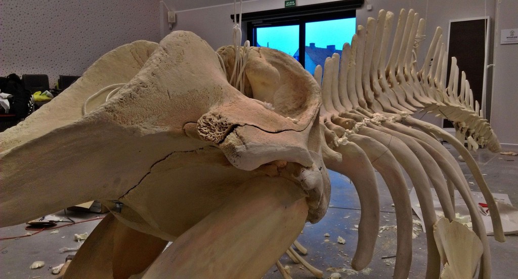 Ważący nieco ponad 120 kilogramów, mierzący 7 metrów i składający się ze 128 elementów układu kostnego szkielet wala butlonosego zawisł w Stacji Morskiej w Helu.