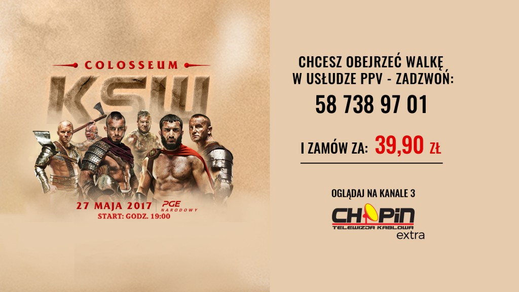 W sobotę (27 maja) Telewizja Kablowa Chopin poprowadzi transmisję z 39 gali KSW. W TK Chopin można zakupić tę usługę w systemie PPV. Podczas 39. gali KSW: Colosseum zobaczymy pierwszy w historii KSW pojedynek dwóch czempionów Mameda Khalidova z Borysem Mańkowskim, ale także starcia Mariusza Pudzianowskiego z Tyberiuszem Kowalczykiem, Marcina Różalskiego, którego przeciwnikiem będzie Fernando Rodriguesa Jr, a Popek Monster powróci do klatki, by skrzyżować rękawice z niepokonanym w MMA, niezwykle popularnym kulturystą, Robertem Burneiką.
