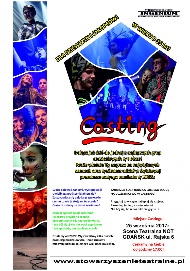 – Przyjdź, pokaż się, zaśpiewaj piosenkę, ewentualnie zatańcz. Odrzuć tremę, a jeśli jesteś niezdecydowany, to wpadaj – nic nie szkodzi, a możesz przeżyć fantastyczną przygodę z teatrem. Nieważne, czy już gdzieś występowałeś, jeśli widząc kogoś młodego na scenie pojawia się w Tobie myśl – czemu to nie ja jestem na jego miejscu? – po prostu przyjdź na nasz casting – zachęca Stowarzyszenie Teatralne "Ingenium".