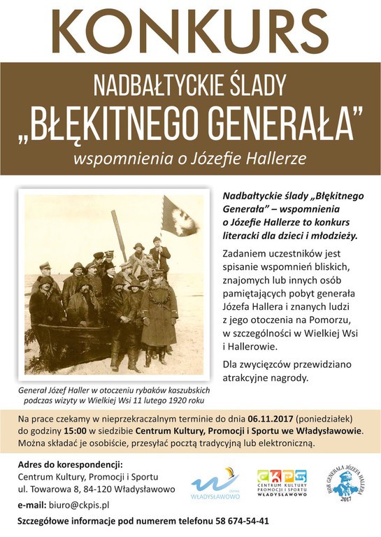 Centrum Kultury, Promocji i Sportu we Władysławowie poszukuje wspomnień o Józefie Hallerze. Pomóc mogą dzieci oraz młodzież w ramach konkursu o nazwie "Nadbałtyckie ślady „Błękitnego Generała” – wspomnienia o Józefie Hallerze". Zgłoszenia można przysyłać do 6 listopada, a na autorów najlepszych prac czekają nagrody.