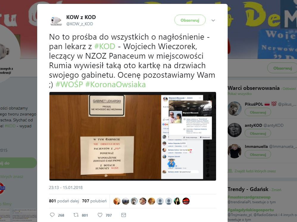 Kilka dni temu lekarz pracujący w jednej z rumskich przychodni wywiesił na drzwiach swojego gabinetu kartkę. Napisał na niej, że nie obsługuje zwolenników partii PiS, gdyż wyposażenie gabinetu zakupiono z funduszy WOŚP. Działanie lekarza wywołało lawinę negatywnych komentarzy, choć znaleźli się także zwolennicy jego teorii. Lekarz postanowił wydać oficjalne oświadczenie.
