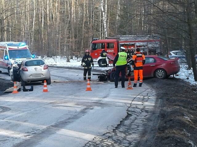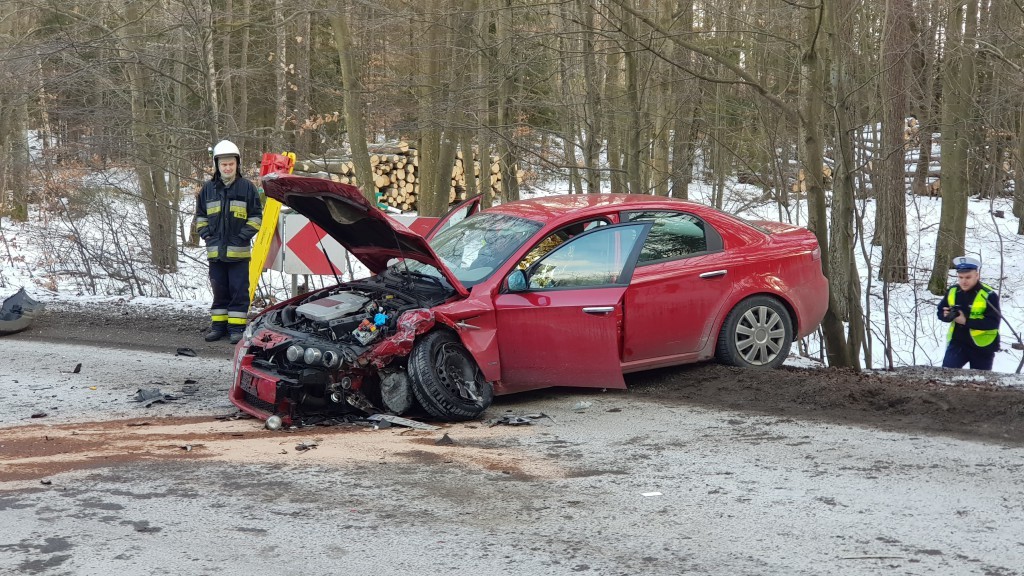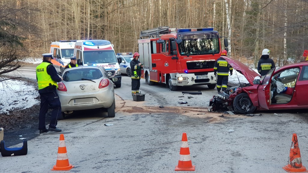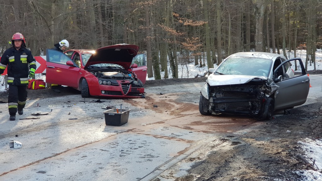 Przybyli na miejsce strażacy zastali dwa samochody osobowe, forda i alfa romeo, które uległy poważnym uszkodzeniom. Istniała konieczność zamknięcia drogi na czas usunięcia pojazdów.