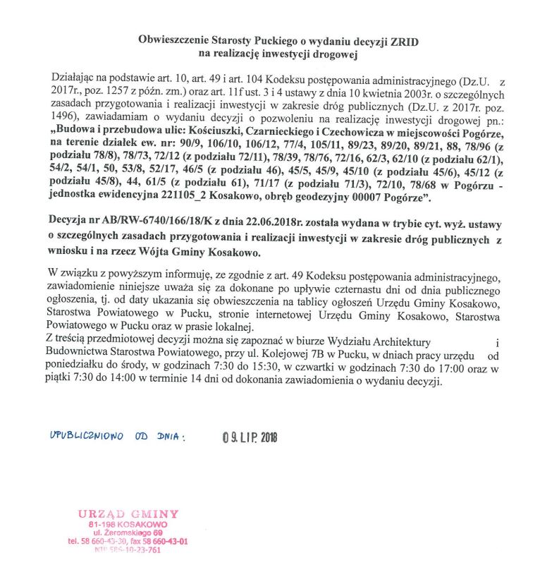 W poniedziałek (9 lipca) starosta pucki poinformował o wydaniu decyzji ZRID na realizację inwestycji drogowej. Projekt dotyczy trzech ulic na Pogórzu.