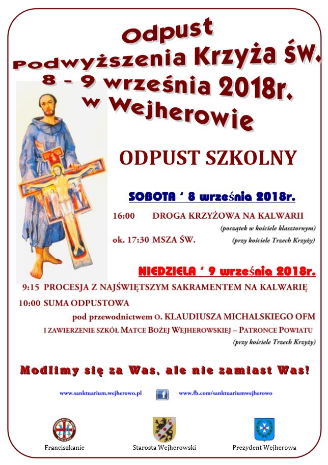 W drugi weekend września (8 i 9 września) na Kalwarii Wejherowskiej odbędzie się coroczny Odpust Podwyższenia Krzyża Świętego. Uroczystość, czyli tzw. odpust szkolny, jest dedykowana przede wszystkim uczniom, rodzicom i pracownikom szkół.