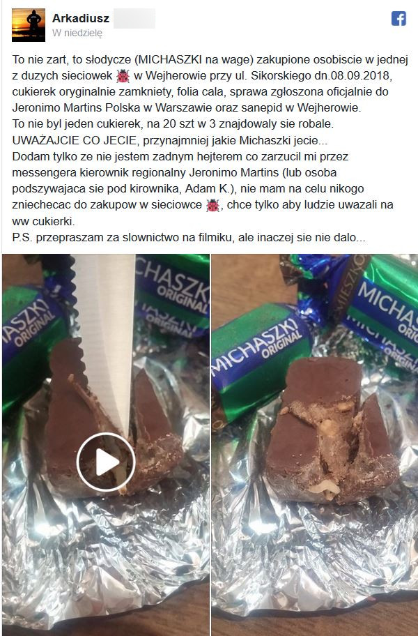– Sprawa zgłoszona oficjalnie do Jeronimo Martins Polska w Warszawie. To nie był jeden cukierek, na 20 sztuk w trzech znajdowały się robale – pisze na portalu pan Arkadiusz.