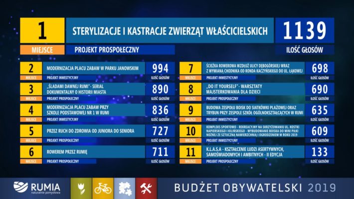 Najwięcej głosów, bo aż 1139 otrzymał projekt „Sterylizacji i kastracji zwierząt właścicielskich”. Wśród zwycięskich pomysłów znalazła się również „Modernizacja Placu Zabaw w Parku Janowskim” oraz „Śladami Dawnej Rumi” - czyli serial dokumentalny o historii miasta. Mieszkańcy zadbają również o swoje zdrowie i sprawność fizyczną, w następnym roku w życie wejdzie projekt „Przez ruch do zdrowia od juniora do seniora” oraz „Rowerem przez Rumię”.