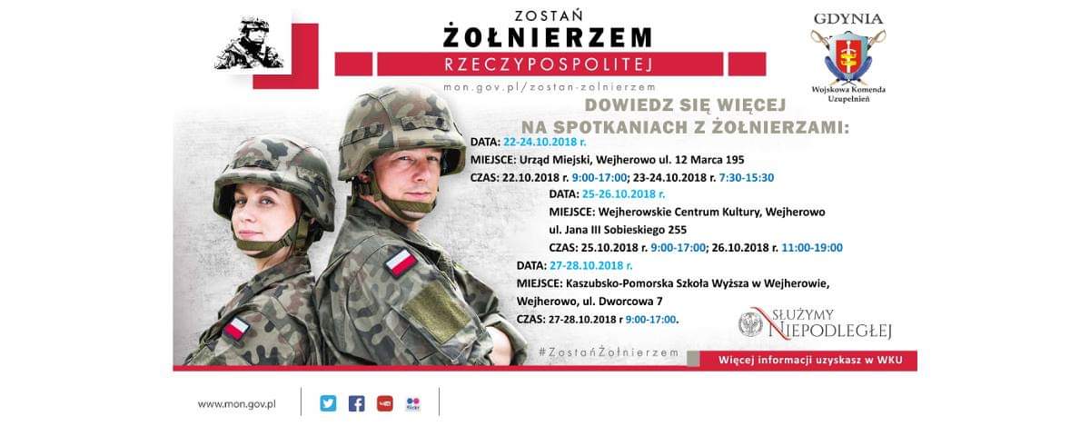 Najbliższy tydzień rekrutacyjny (22–28 października) odbędzie się w powiecie wejherowskim. W tym czasie żołnierze z lokalnych jednostek wojskowych, przedstawiciele Wojskowych Komend Uzupełnień lub Wojewódzkich Sztabów Wojskowych, wyruszą w teren i będą przekonywać do wstąpienia do armii.
