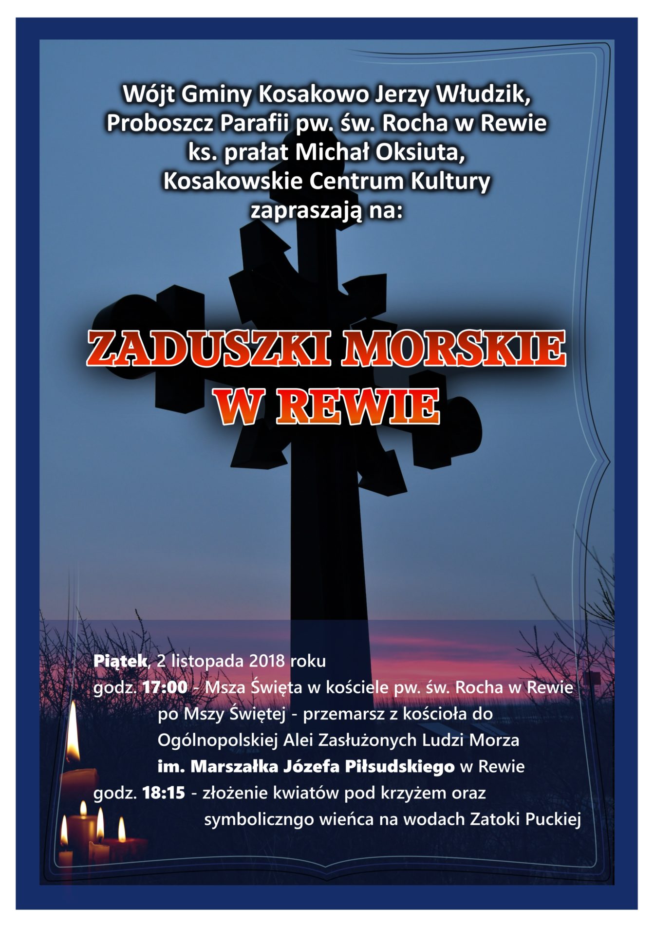 Jak co roku, w Rewie odbędą się Zaduszki Morskie, aby oddać hołd tym, którzy związali swoje życie z morzem, jak i zginęli na morzu. Obchody odbędą się w piątek 2 listopada 2018 r. Rozpoczną się o godz. 17:00 Mszą Świętą w Kościele pw. Św. Rocha w Rewie. Po mszy nastąpi przemarsz z kościoła na Ogólnopolską Aleję Zasłużonych Ludzi Morza im. Marszałka Józefa Piłsudskiego, gdzie pod Krzyżem Morskim zostaną złożone kwiaty oraz zapalone znicze, a na wody Zatoki Puckiej puszczony zostanie symboliczny wieniec.