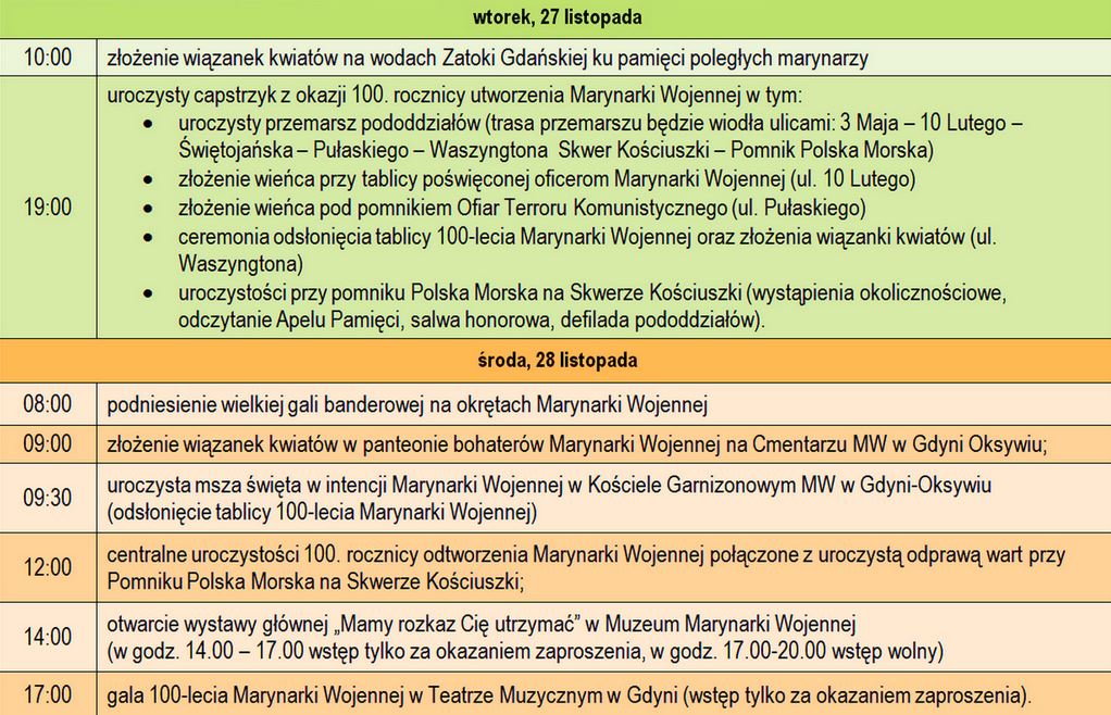 Główne uroczystości rocznicowe odbędą się w najbliższą środę (28 listopada). Na wszystkich okrętach Marynarki Wojennej zostanie podniesiona wielka gala banderowa. Z Okrętu-Muzeum ORP Błyskawica zostanie oddany salut świąteczny 21 wystrzałów armatnich. Tego samego dnia przy Skwerze Kościuszki zacumują i zostaną udostępnione (w godz. 9:00–15:00) do zwiedzania jednostki: fregata rakietowa ORP Kościuszko, okręt podwodny ORP Sęp i niszczyciel min ORP Kormoran. Szczegółowy program uroczystości zamieszczamy poniżej.