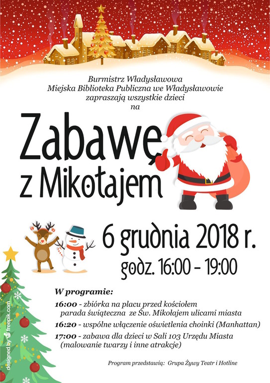 Burmistrz Władysławowa oraz Miejska Biblioteka Publiczna we Władysławowie zapraszają wszystkie dzieci na Zabawę z Mikołajem w dniu 6 grudnia 2018 r.