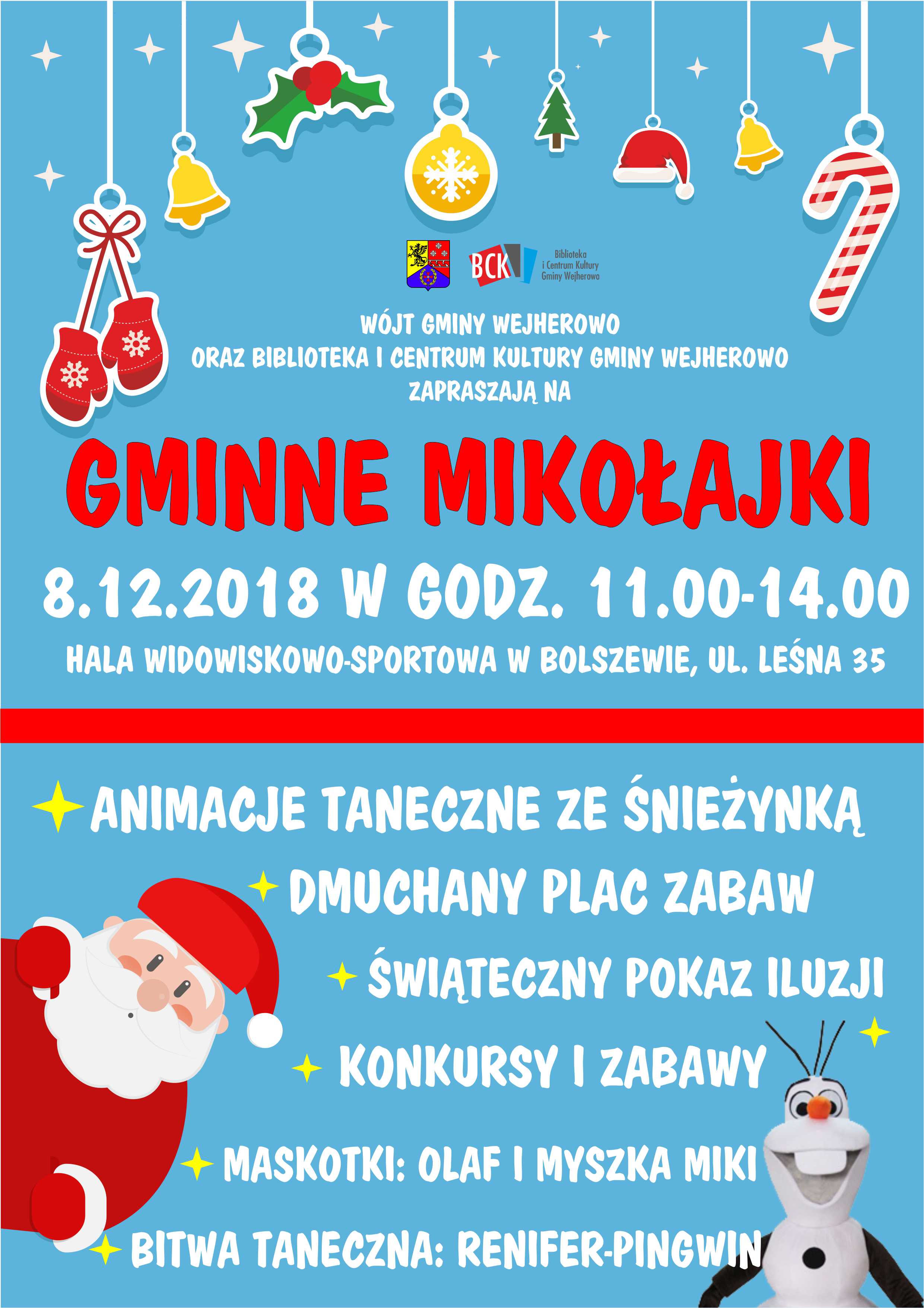 – Nie zabraknie tanecznych animacji, wspólnych zabaw na dmuchańcach, konkursów z nagrodami, świątecznego pokazu iluzji. Dzieci odwiedzi także Olaf z „Krainy Lodu” i Myszka Miki – informują przedstawiciele Urzędu Gminy Wejherowo.