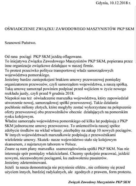 Poniżej znajduje się oświadczenie wydane przez Związek Zawodowy Maszynistów PKP SKM: