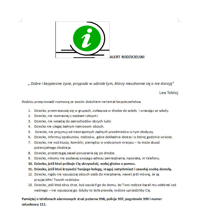 „Dobre i bezpieczne życie, przypada w udziale tym, którzy nieustannie się o nie starają” - te słowa Lwa Tołstoja otwierają przesłane do rodziców trzynastopunktowe zasady, które każde dziecko powinno znać i przestrzegać.