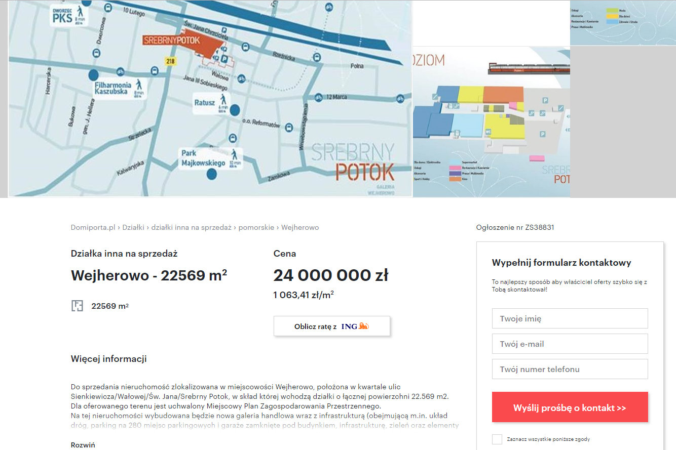 – Do sprzedania nieruchomość zlokalizowana w miejscowości Wejherowo, położona w kwartale ulic Sienkiewicza/Wałowej/Św. Jana/Srebrny Potok, w skład której wchodzą działki o łącznej powierzchni 22 569 m kw. Dla oferowanego terenu jest uchwalony Miejscowy Plan Zagospodarowania Przestrzennego. Na tej nieruchomości wybudowana będzie nowa galeria handlowa wraz z infrastrukturą – czytamy w ogłoszeniu.