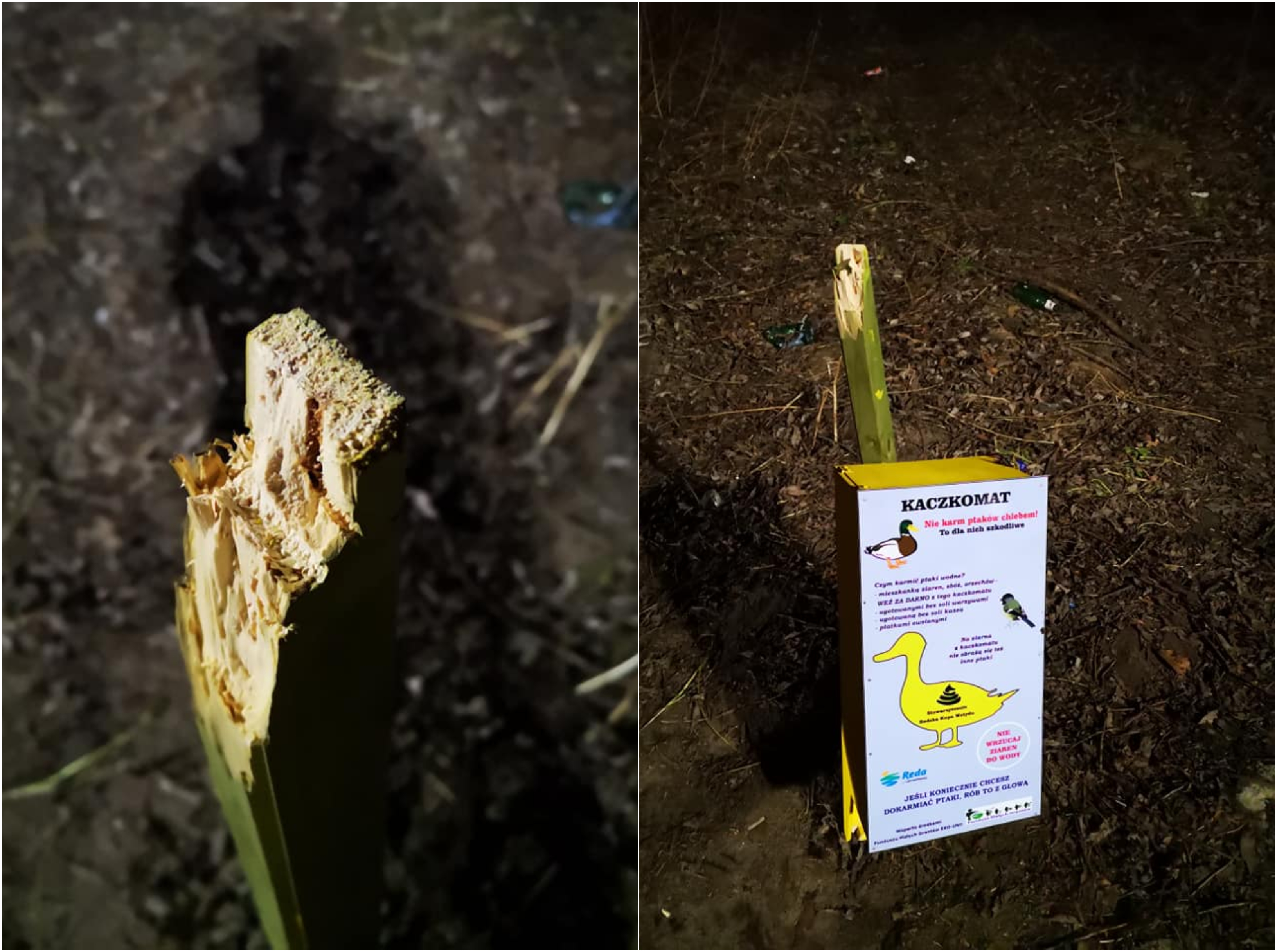 Informując pod koniec stycznia o tym, że „kaczkomaty” w redzkim parku już czekają na spacerowiczów, na pewno nie mieliśmy na myśli wandali. Niestety, popularne urządzenia do karmienia ptaków przyciągnęły ich uwagę. Efekt? Złamany solidny palik, na którym zamontowano jeden z „kaczkomatów”. O zdarzeniu, do którego doszło prawdopodobne w sobotę (16 lutego) wieczorem, poinformowało na swoim profilu facebookowym Stowarzyszenie Redzka Kupa Wstydu.